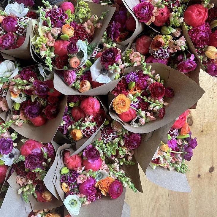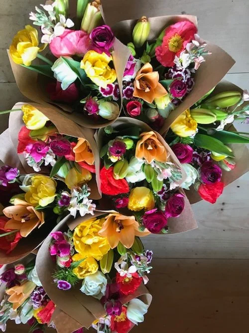 Each week the composition of the bouquets subtly shifts starting with spring flowers like tulips, ranunculus and anemones and takes you all the way though high summer blooms like zinnias, sunflowers. -