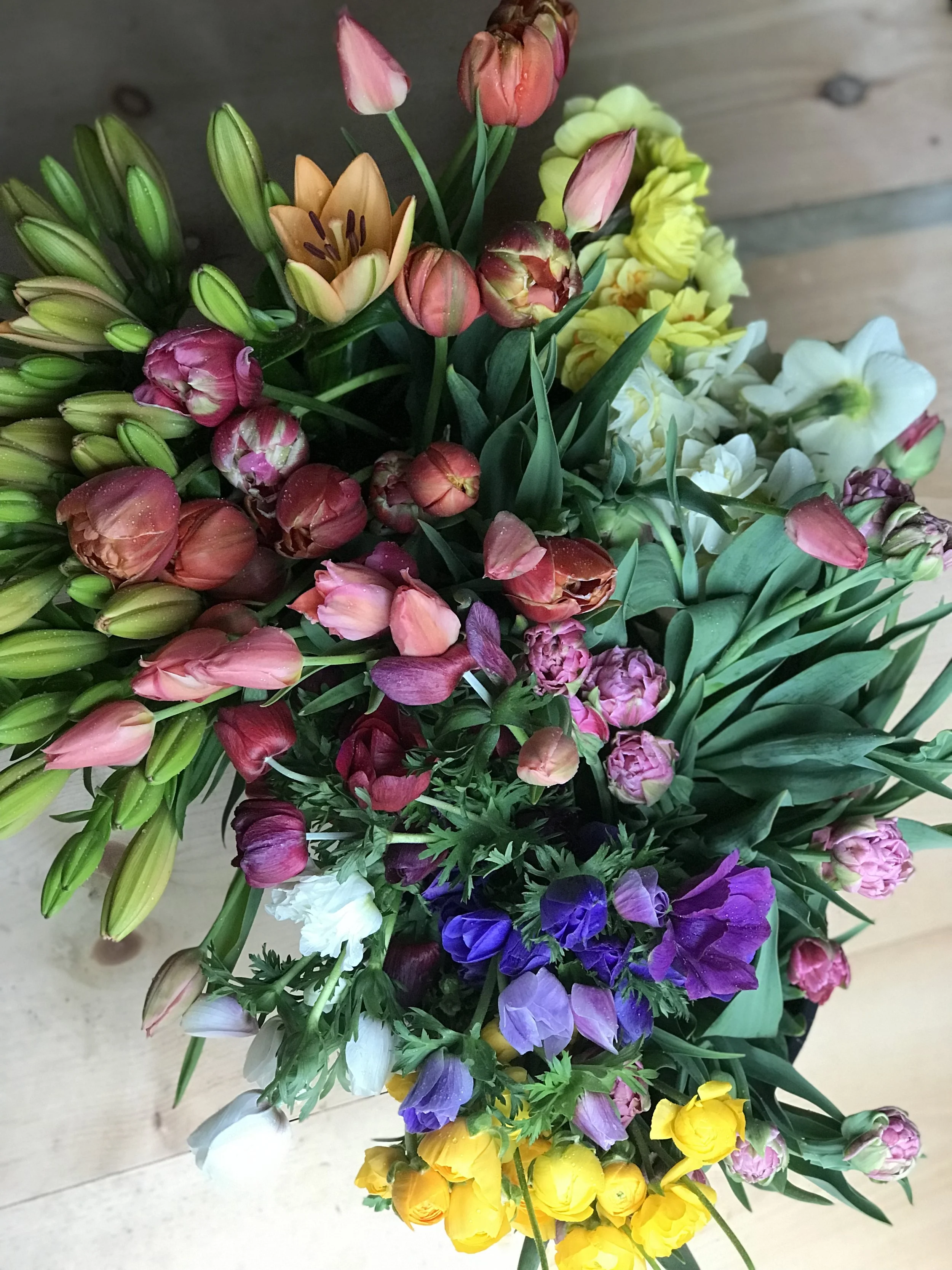 A petite, handheld bouquet of local, seasonal, farm-fresh flowers. A gift for someone special at prom-time. Made up of a few focal blooms, smaller accent blooms and a bit of greenery. Sweet and simple and all wrapped in with a bow!